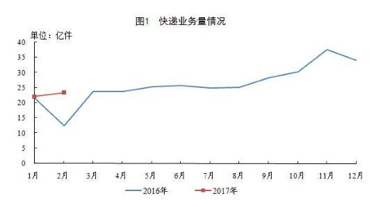 2017年2月郵政行業(yè)運行情況,全國快遞服務企業(yè)業(yè)務量完成23.4億件,業(yè)務收入完成292.2億元。
