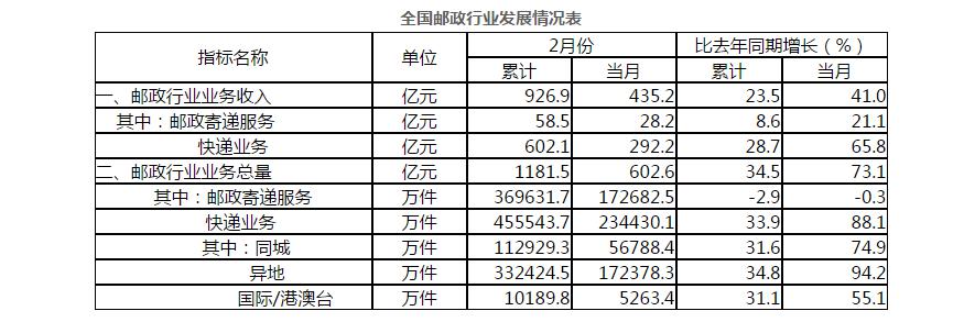 2月份,全行業(yè)業(yè)務收入完成435.2億元,同比增長41%;業(yè)務總量完成602.6億元,同比增長73.1%。