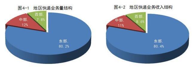 與去年同期相比,東部地區(qū)快遞業(yè)務量比重上升了0.6個百分點,快遞業(yè)務收入比重上升了0.4個百分點;