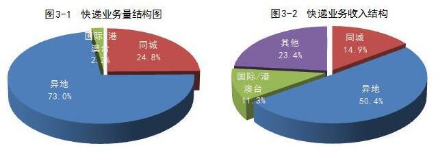 與去年同期相比,同城快遞業(yè)務量的比重下降0.4個百分點,異地快遞業(yè)務量的比重上升0.5個百分點,國際/港澳臺業(yè)務量的比重下降0.1個百分點。